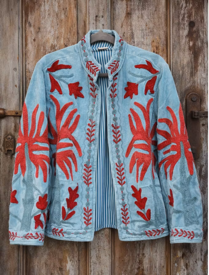 Den älskade Boho Soul Velvet Jacket i en ny ljuvlig färg — ljusblå sammet med handgjorda broderier . Varje jacka är skapad för hand i Indien, där traditionellt hantverk möter modern boho-estetik.