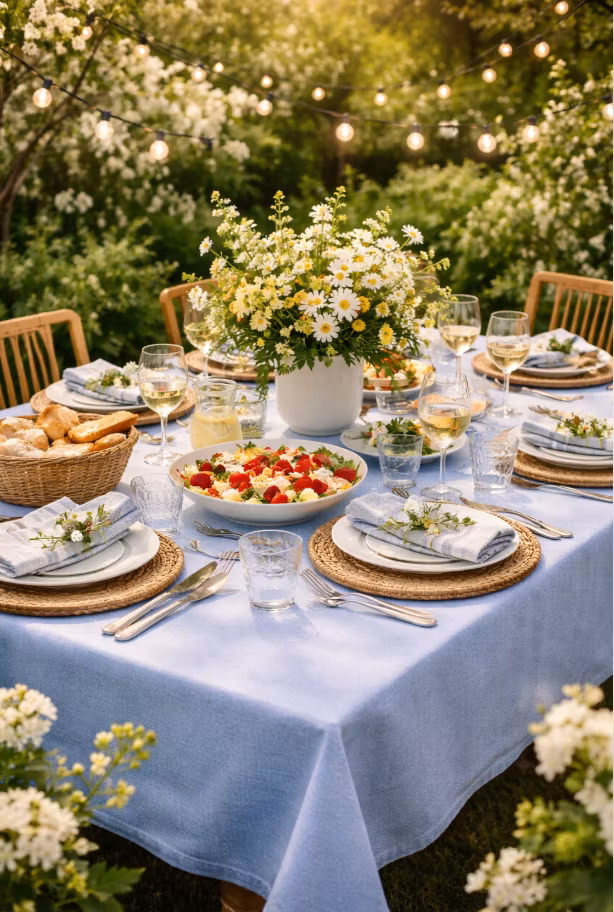 Denna eleganta duk i bomull/polyester är skapad för långa, ljusa stunder runt bordet. Med sin mjuka, ljusblå ton ger den en fräsch och somrig känsla som passar lika fint i trädgården som på terrassen eller vid poolen. Tygets blandning av bomull och polyester ger ett vackert fall samtidigt som det är slitstarkt och lättskött – perfekt för både vardag och fest.