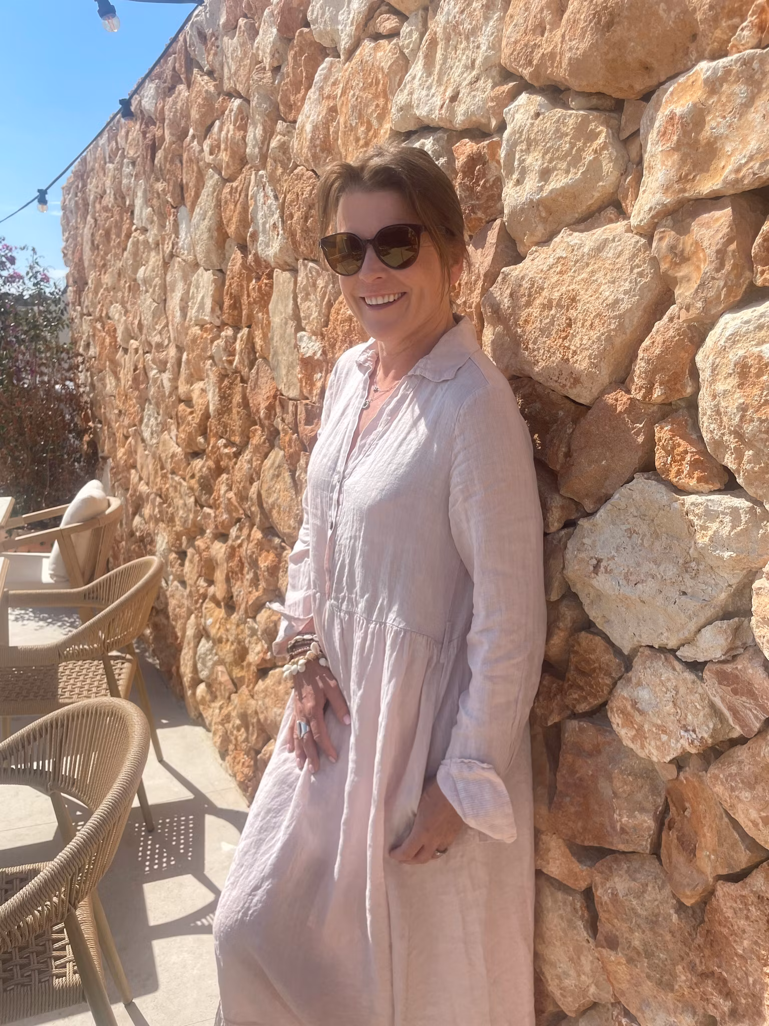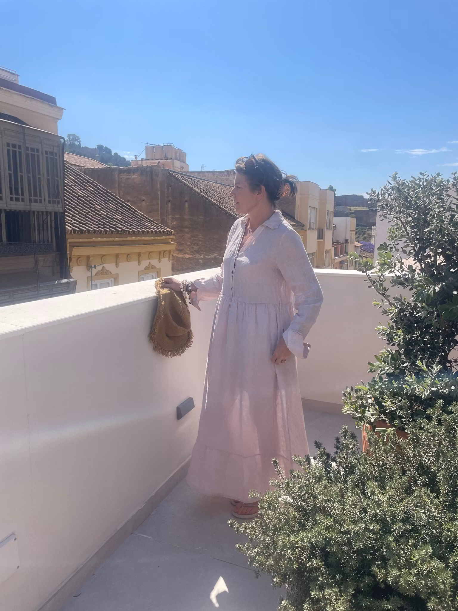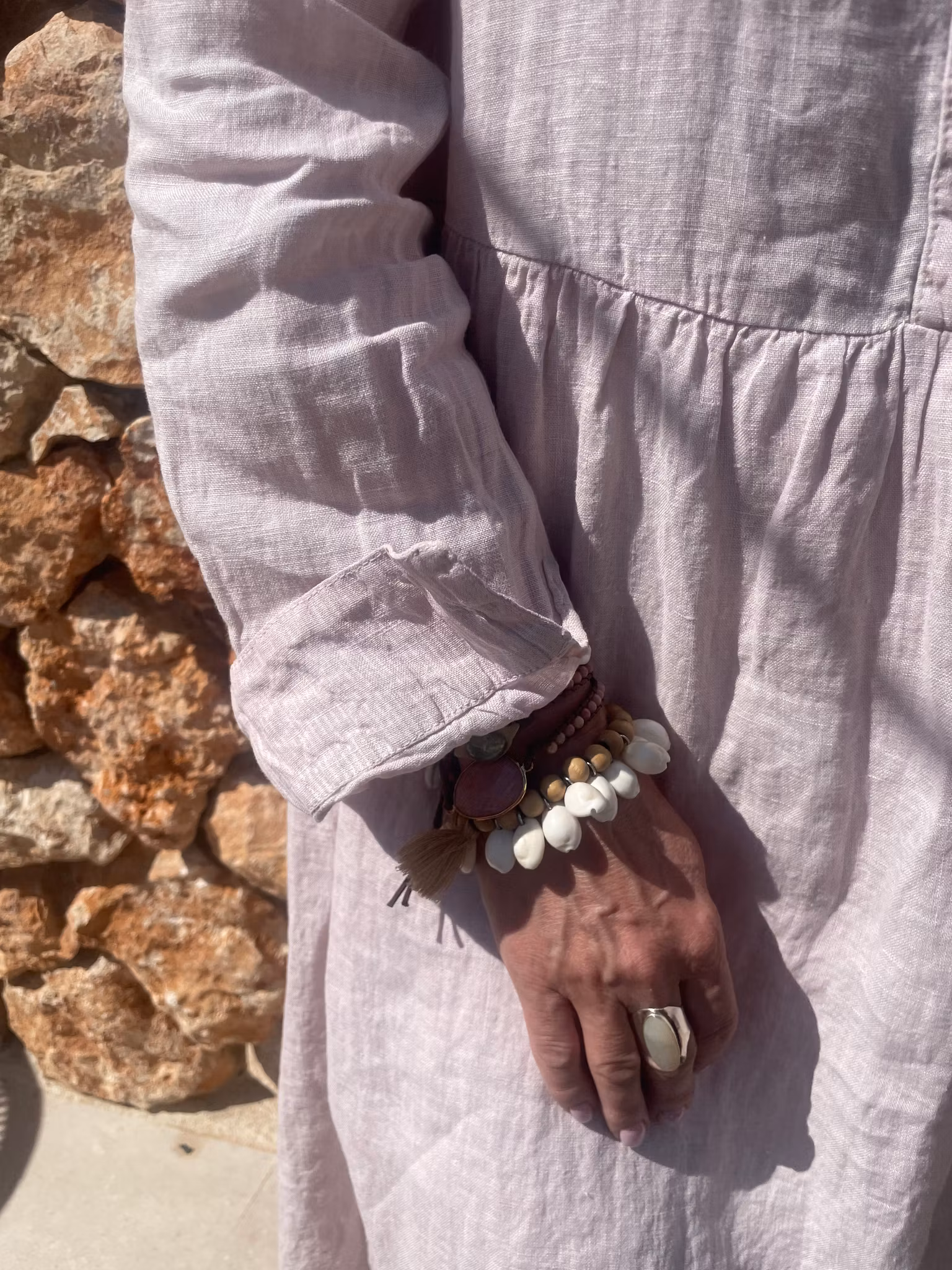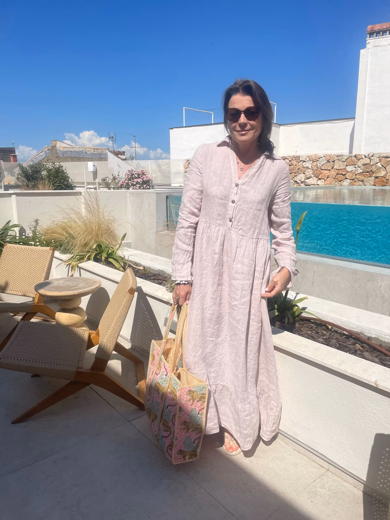 Följ med trenden och omfamna enkel elegans med denna vackra linne maxiklänning. Den feminin V-ringningen och knappslutningen längs fronten ger en vacker, sofistikerad silhuett, medan de praktiska fickorna med en randig insida matchande klänningens färg tillför en subtil men stilfull detalj. Ärmarna kan justeras och knäppas upp för en mer avslappnad look, och den randiga insidan syns även här som en fin accent. Klänningen levereras med ett matchande linneskärp som framhäver din midja, men bärs lika vackert utan för en mer ledig, flödande känsla.