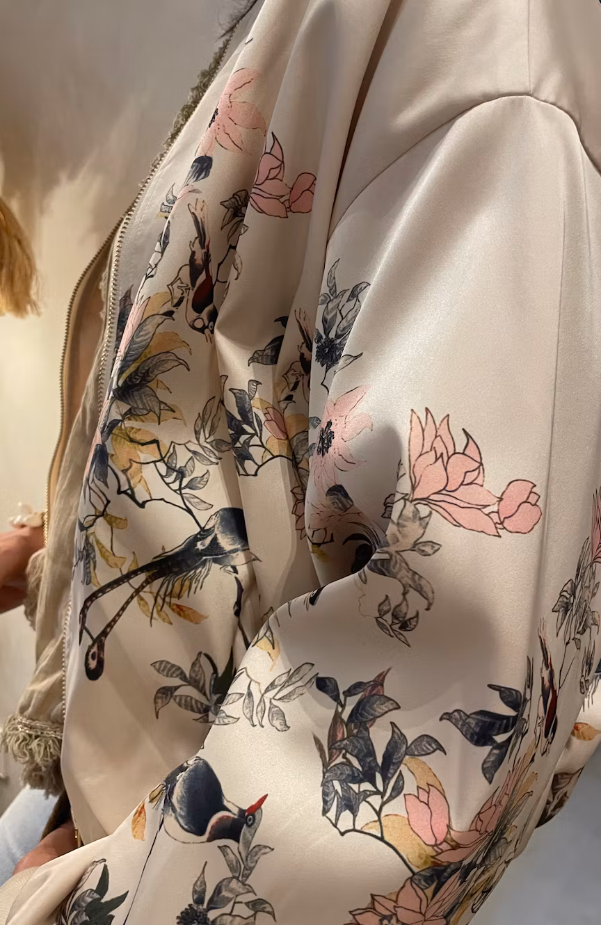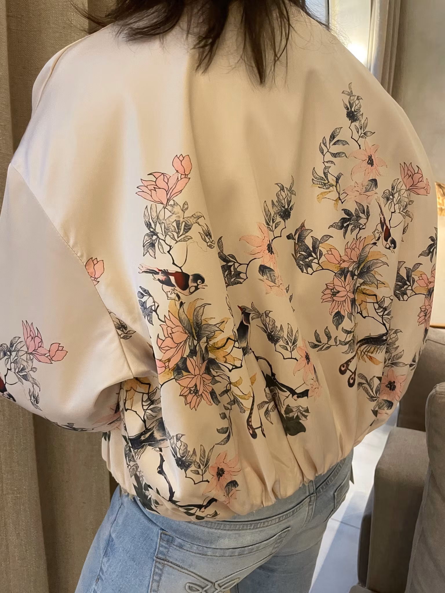 Denna bomberjacka är en hyllning till naturens poesi. Med ett detaljrikt mönster av blommande grenar och småfåglar på en mjuk, krämfärgad bakgrund, kombinerar den romantisk estetik med modern streetwear-stil. Perfekt för dig som vill bära ett konstverk – varje gång du går ut. Dragskedja i guld färg. One size Kort i modellen.