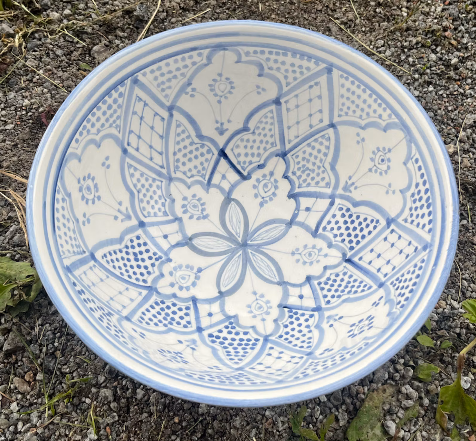 Marockansk keramik ljusblå olika storlekar 10-35 cm keramiken är handgjord och handmålade med ett traditionellt marockanskt mönster. En vacker inredningsdetalj att ha hemma och servera mat/frukt i eller att ha stående på bordet.Skålen är unik och eftersom den är handgjord kan det skilja sig åt något i nyans.