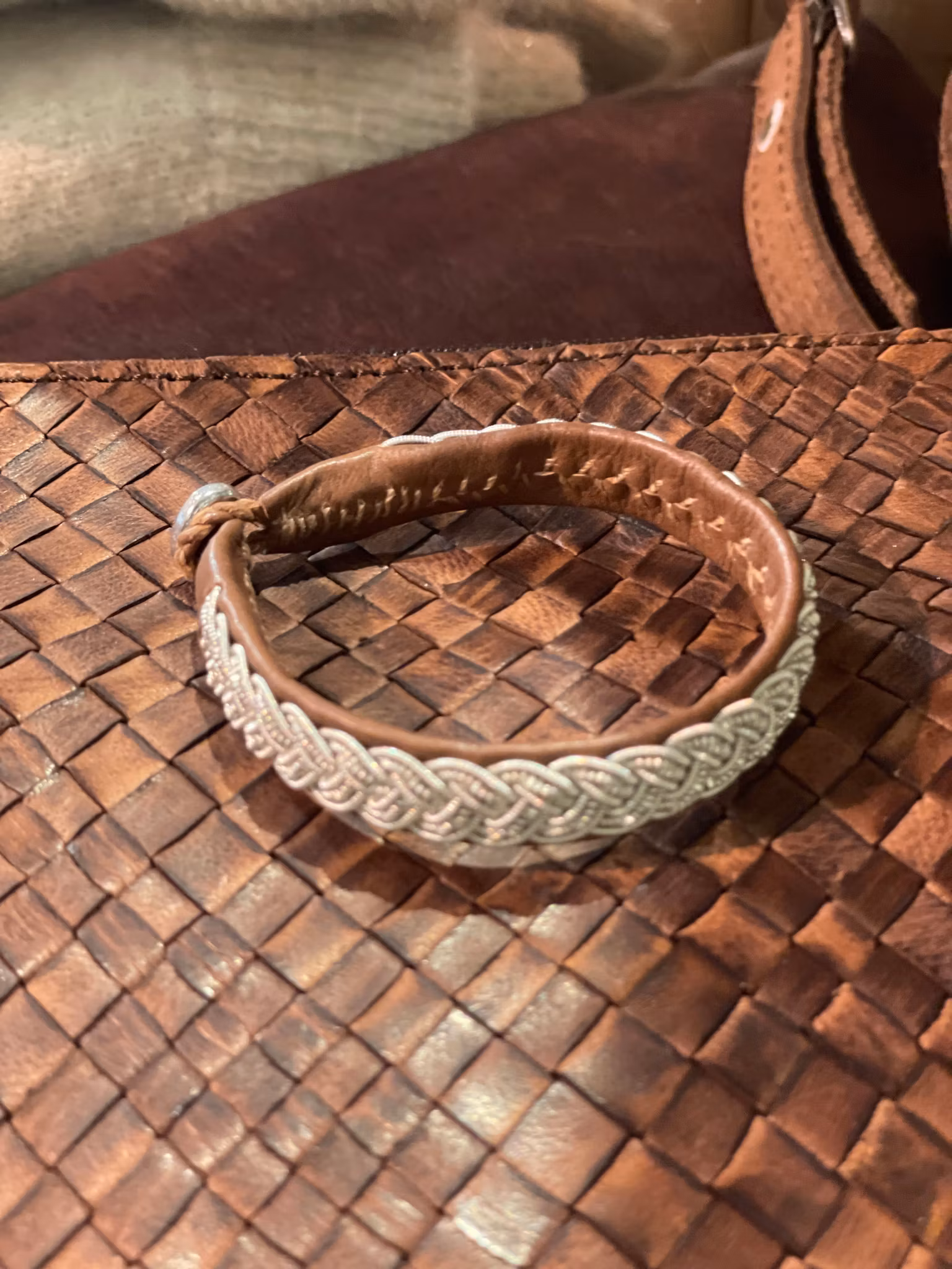 Siri är ett elegant och tidlöst samiskt armband, handsytt med mjukt äkta renskinn och ett vackert, tätt flätat tenntrådsbroderi. Varje detalj är skapad med traditionell precision och gediget hantverk.