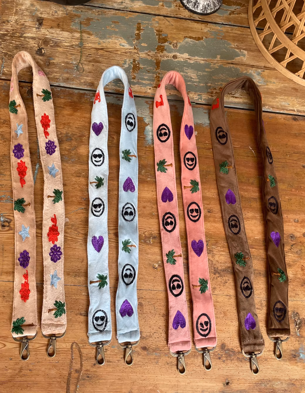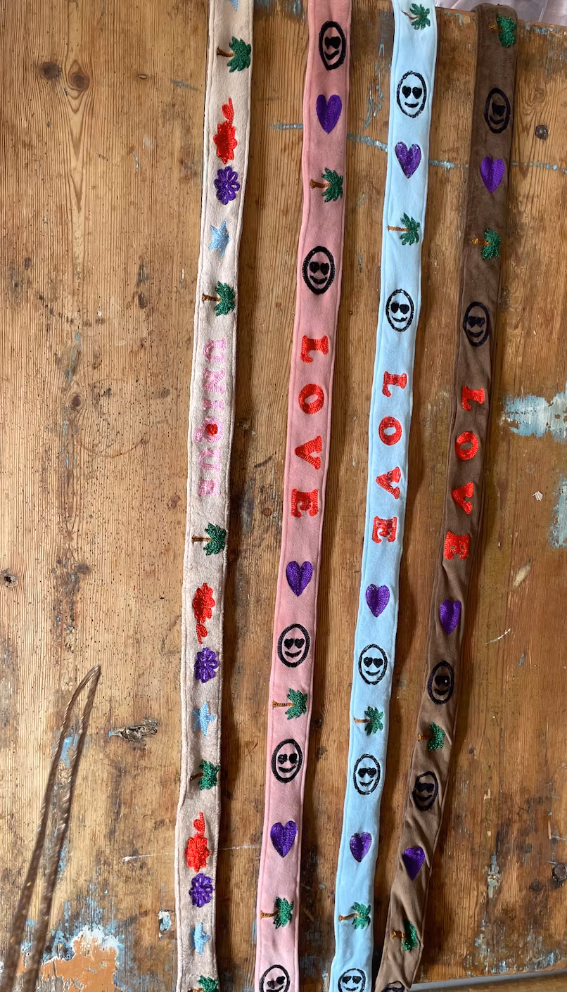 Våra broderade väska-remmar kombinerar funktion och personlighet i ett uttrycksfullt tillbehör. De mjuka textilremmarna är dekorerade med lekfulla motiv som hjärtan, palmer, blommor och smileys i glittrande brodyr – perfekta för att ge din favoritväska ett nytt liv.